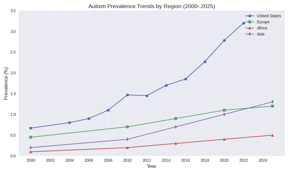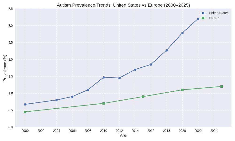 Most often the differences can be directly linked to diagnostic service, by region. It seems that with regards to autism, the US has better diagnostics in place, because the disability is more prevalent.