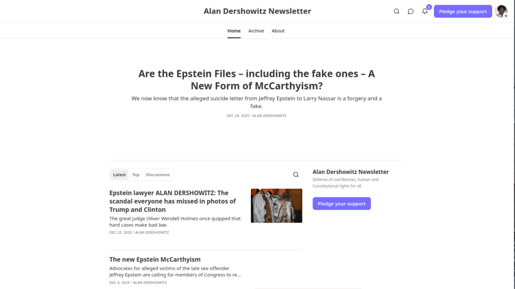 The front page of Dershowitz substack; he is pushing for fake documents. Apparently not updated since 12-Dec-2025: